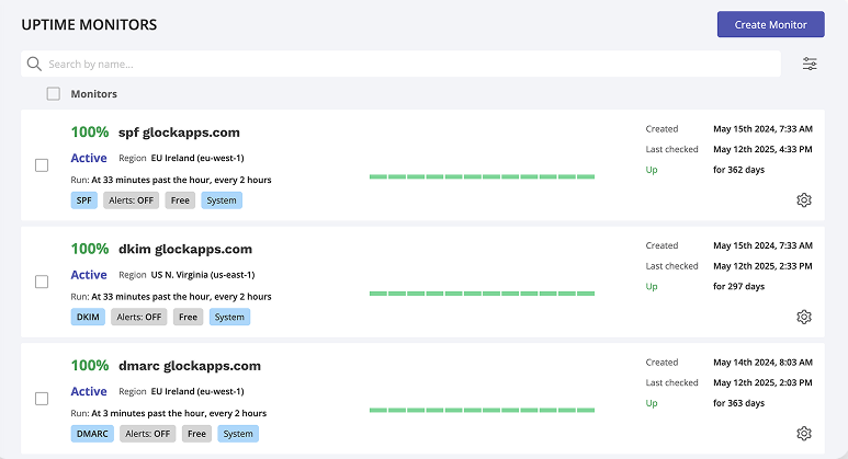 Beyond basic spam testing, GlockApps also integrates DMARC reporting, giving us visibility into our email authentication status across our sending infrastructure. We find the uptime monitors and IP reputation features particularly useful for proactive monitoring, helping us catch potential issues before they escalate and impact our sending reputation (or blocklist status).